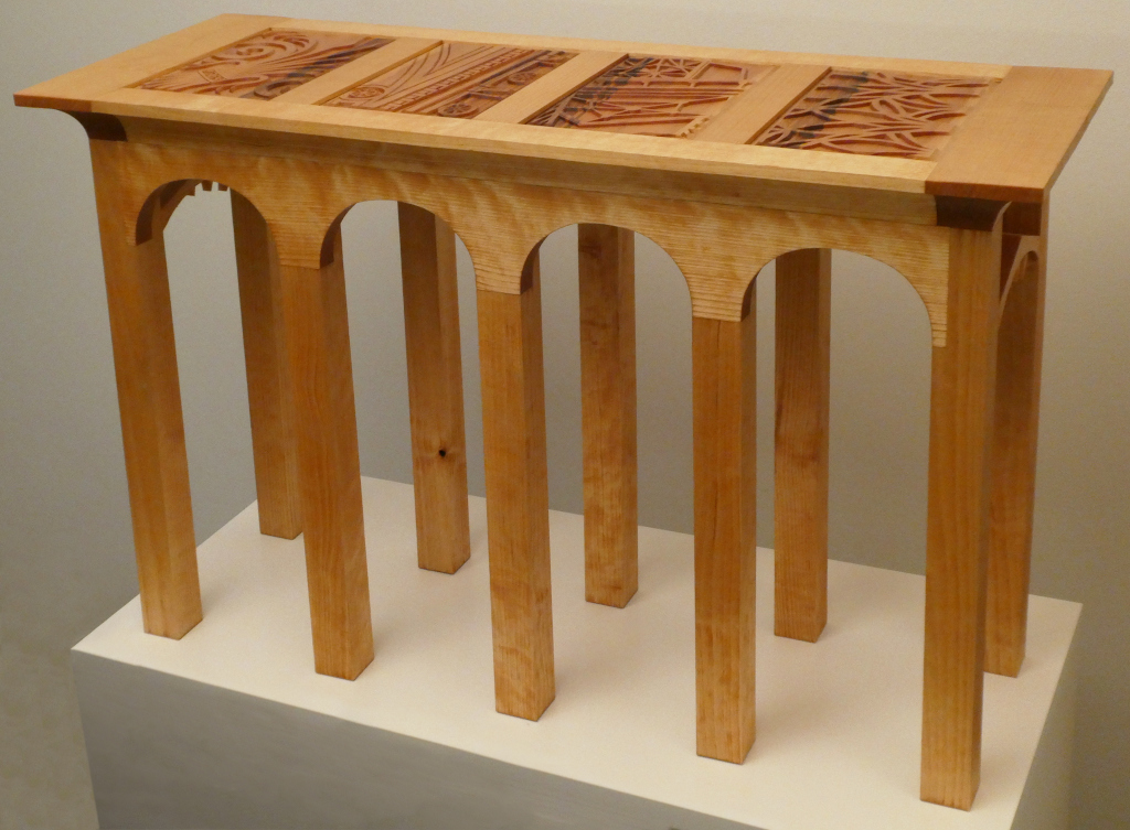 bordet till gångar av ben. Svängda takutsprång blir till en bordsskiva som